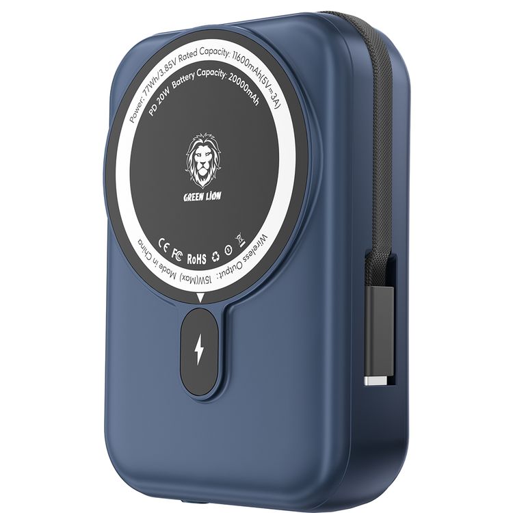 Green Lion 20000mAh Monaco MagSafe Power Bank with Built-in Type-C Cable, LCD Display, 20W Power Delivery, Magnetic Attraction, Compact Design - Dark Blue
