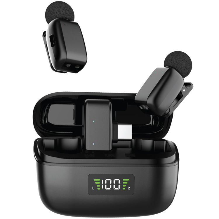 Green Lion Flex Mic Duo Microphones with Type-C & Lightning Connector 2-in-1, Digital Display, Up to 5 Hours Battery Life, Voice Changer Function, Wireless Transmission, ANC Technology, Plug & Play, 20m Transmission Distance - Black