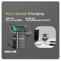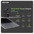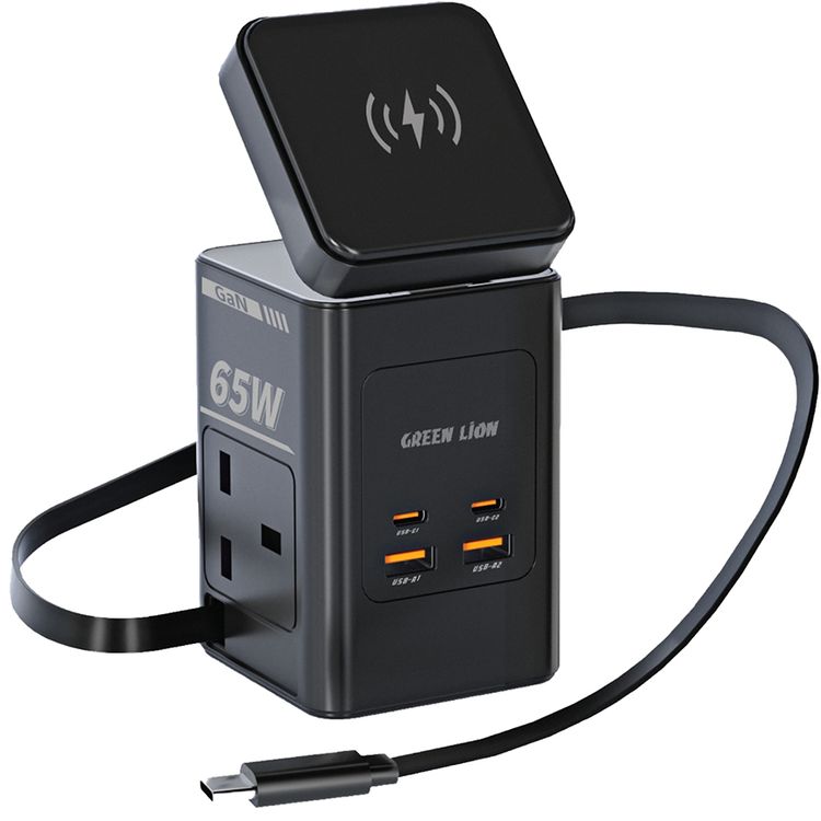 Green Lion GaN 65W Multi-Port Travel Adapter with 8-in-1 Station, ABS & PC Material, 2× AC Sockets, 2× USB-C & 2× USB-A Ports, 80cm Retractable Cable, 2500W Max Power, MagSafe Compatible, GaN Technology, Wide Compatibility, Safety Shutters - Black