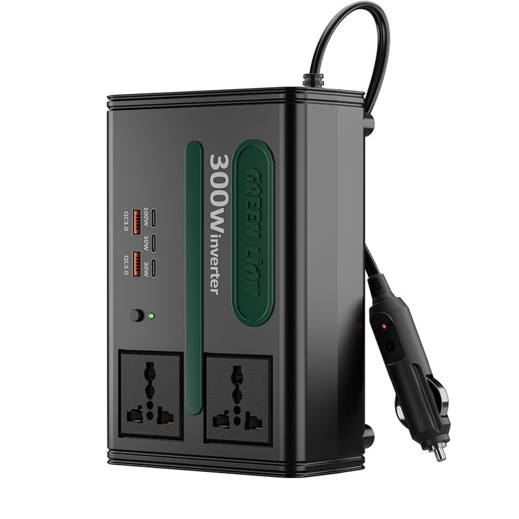 Green Lion GC-300 Car Inverter with 300W Power, 7-in-1 Multiport, Built-in Cooling Fan, Safety Fuse, 220V AC Output, 50cm Cord Length, DC 12.8V Input Voltage - Black