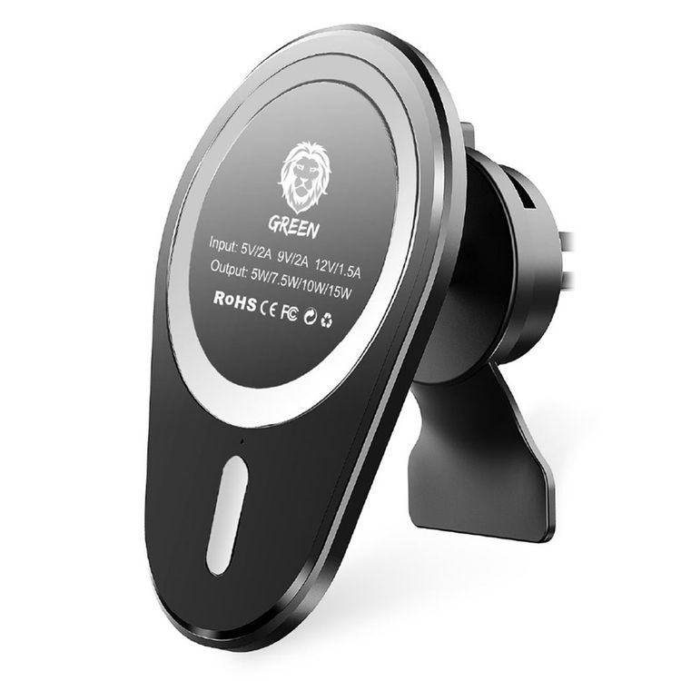 Green Lion Magnetic Wireless Fast Charging Car Mount 15W, Portable, Compact Design, Stick-on Holder, Lightweight, Air Vent - Black