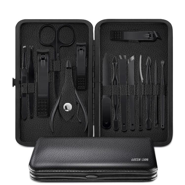 Green Lion Limpia 15 in 1 Manicure & Pedicure Kit, Stainless Steel PU Leather Nail Clipper Set, Non-Slip Tool Kit, Unisex Portable Travel Grooming Kit - Black