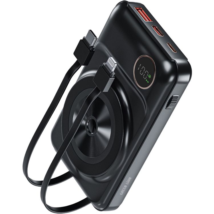 Green Lion MagSafe Integrated Power Bank, 10000mAh, PD 20W, 15W Wireless Charging, USB-A Port, Lightning Cable Output, LED Digital Display - Black