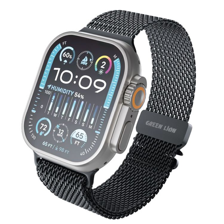 Green Lion Milanese Loop Strap for iWatch 42/44/45/46/49 mm with Stainless Steel Material, Quick Release, Adjustable Length - Black