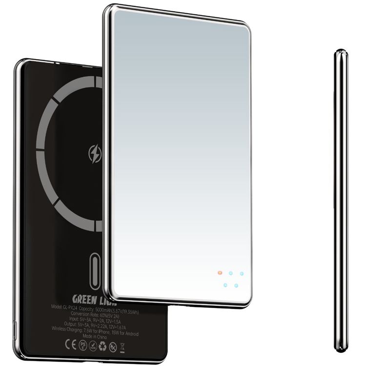 Green Lion Mirror Design 5000mAh Power Bank with LED Indicator, Type-C Port, 20W Power Delivery, 15W Wireless Output, Aluminum & Glass Material, Ultra-Thin & Ultra-Light Design, Fast Charge - Black
