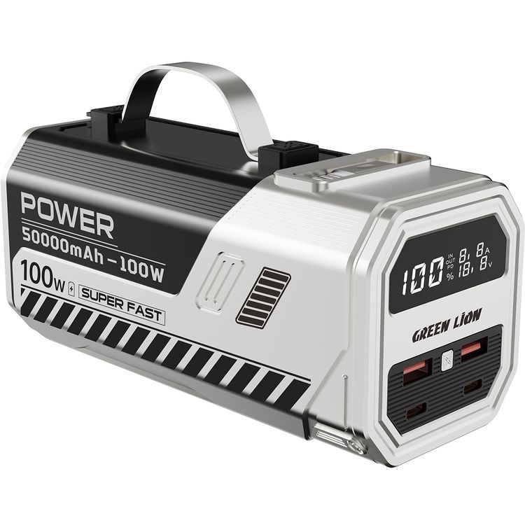 Green Lion 50000mAh Power Bank with 100W Max Power, Built-in 1.5m Retractable Cable, 2× USB-A, 2× USB-C Ports, Digital Display, LED Flashlight - Silver
