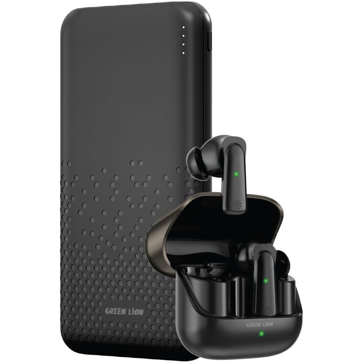 Green Lion Rome Power Bank & TWS Earbuds, Cutting-edge 2-in-1 Gadget, 10000 mAh Power Bank Battery Capacity, 200 mAh TWS Charging Case Capacity, Dual USB-A Port, 4.5 Hours Talk Time, 4 Hours Play Time - Black