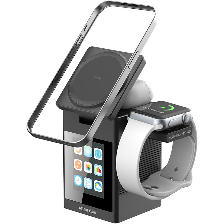 Green Lion Smart Station Pro with Wireless Charger, Speaker, Clock, Alarm, ABS + PC & Silicone Material, 8× N52 Magnets, 1000mAh Battery Capacity, Bluetooth Version 5.3, 10m Working Range, 2 Hours Charging Time, 2.5 Hours Working Time, Type-C Input Port, Smart Touch Display - Black