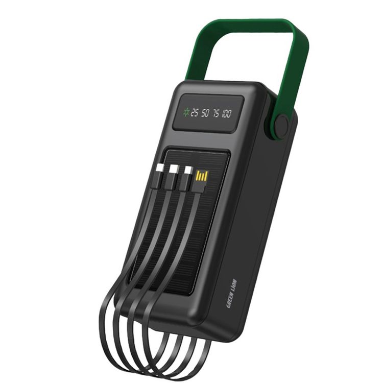 Green Lion Solar Max 50000mAh Powerbank with Digital Display, Solar Charging Panel, Type-C/Micro/Lightening/USB-A Output, lightweight & Portable, 4 Integrated Cables - Black