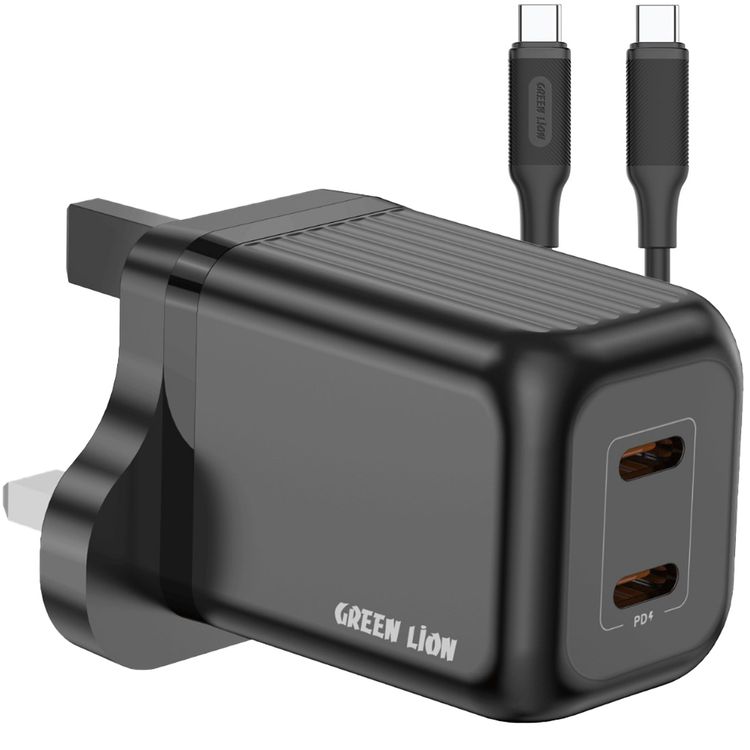 Green Lion Ultra Compact GaN Wall Charger with Type-C to Type-C Cable, PD 45W, Dual USB-C Ports, PC Flame Retardant Material, 3-Pin UK Power Plug, Charging Protection, GaNStorm Technology - Black
