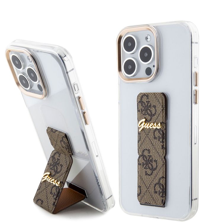 Guess Grip stand Clear Case with 4G Script Logo for iPhone 15 Series - Brown - iPhone 15 Pro