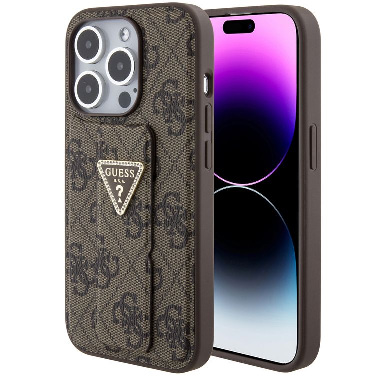 Guess Gripstand PU Leather Case with 4G Triangle Strass Pattern - Brown - iPhone 15 Pro