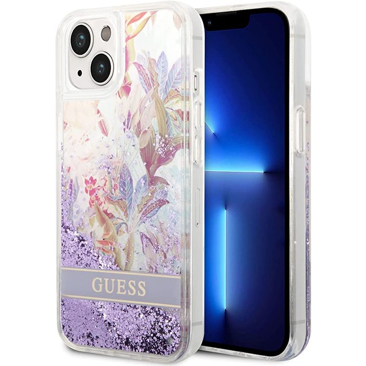 Guess Liquid Glitter Case with Flower Pattern Extra Shine Smooth Touch Feel iPhone 14 Plus Compatibility - Purple
