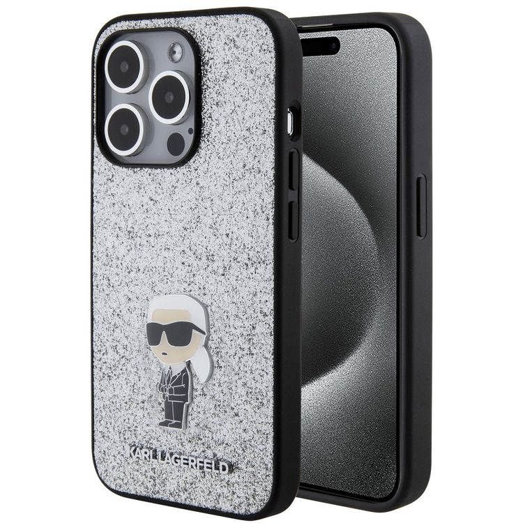 Karl Lagerfeld Fixed Glitter Case with Ikonik Logo Metal Pin - Silver - iPhone 15 Pro