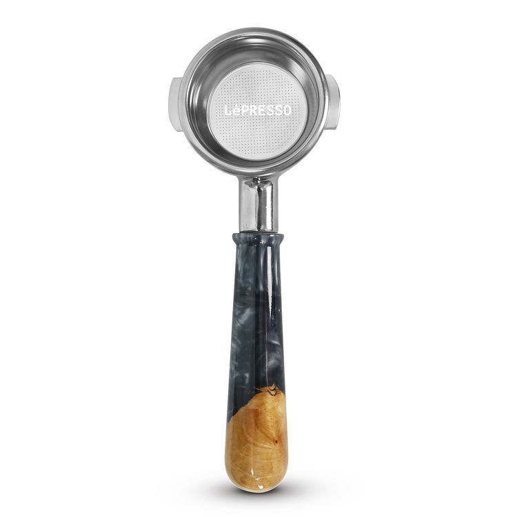 LePresso Bottomless Portafilter for 58mm Coffee Machines, Stainless Steel, Resin & Wood Material, Ergonomic Design, Compact & Portable - Brown
