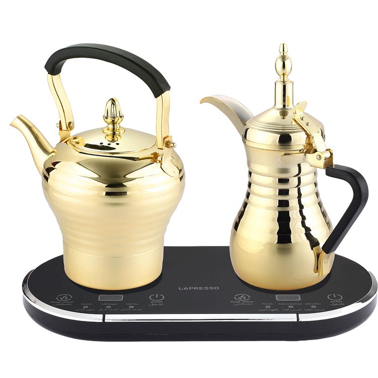 LePresso Electrical Arabic Coffee and Tea Dallah with Over-Heat Protection, 800mL Tea Pot Capacity, 750mL Coffee Pot Capacity, Simultaneous Preparation, Keep Warm - Gold