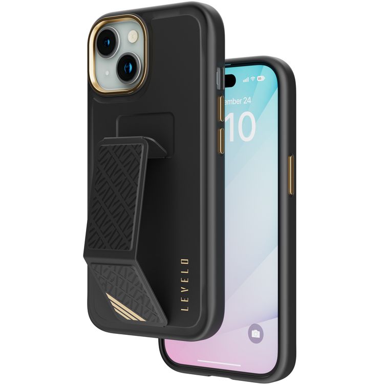 Levelo Morphix Cuero Gripstand Case for iPhone 15, Multi-Positioning Modes, PU Leather Material, Shock-Proof Edges, Built-in Grip - Black