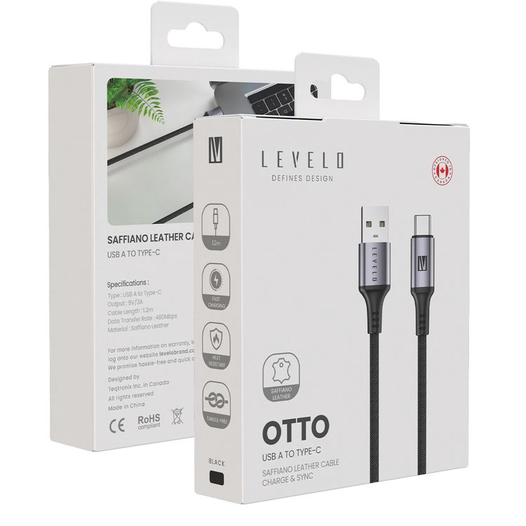 Levelo Otto USB-A to USB-C Cable with Heat-Resistant, Fast Charge & Data Sync, 480Mbps Data Transfer Rate, Tangle-Free, 1.2m Cable Length - Black