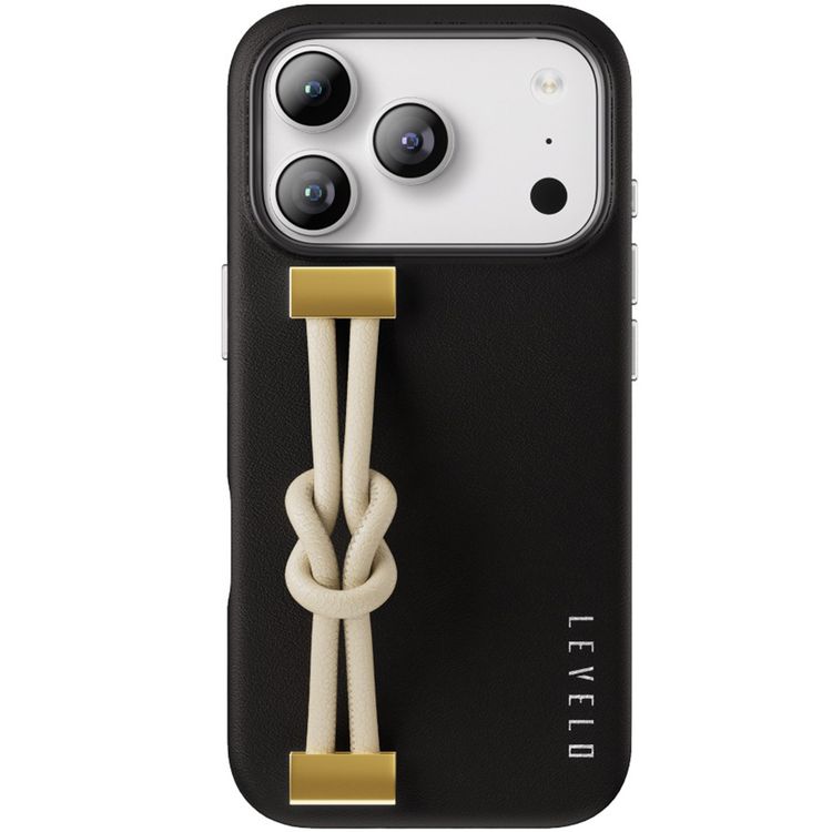 Levelo Polaris PU Leather Case with Wrist-Strap Grip for iPhone 17 Pro, Microfiber Inner Lining, Raised Bezels for Camera & Screen, Shock-Resistant Bumper, Drop-Tested - Black