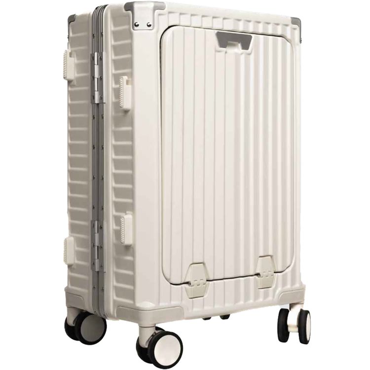 Levelo RoamRollers 20" Travel Luggage with Aluminum Body Material, USB-A & USB-C Output Ports, Metal Corner Protection, Front Pocket Compatible with Up to 15.6" Laptop, Phone and Cup Holder, Silent Spinner Wheels - White