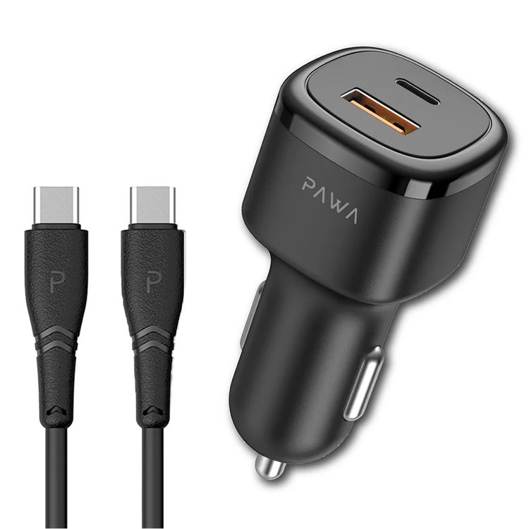 Pawa Solid Car Charger PD 35W & QC Ports with Type-C to Type-C Cable, Overcharge Protection, Premium Design, QC 3.0 18W, Lightweight & Portable, Dual USB-C & USB-A Ports - Black