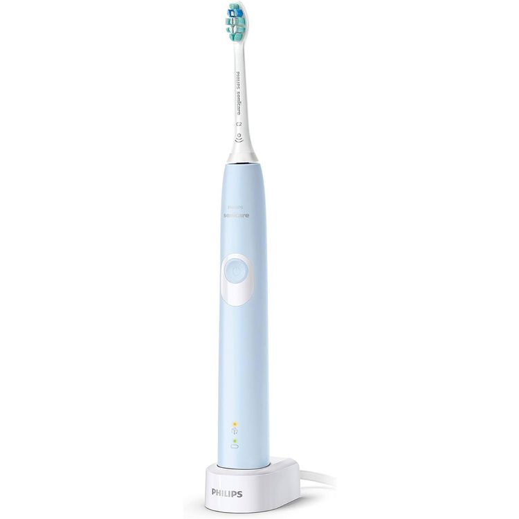 The Philips Sonicare ProtectiveClean 4300 Sonic Electric Toothbrush in Light Blue offers great oral care. This unique toothbrush has convenient click-on brush heads and a small, ergonomic handle that is meant to be comfortable and easy to use. With just one charge, the rechargeable lithium-ion battery powers the device. It provides up to two weeks of brushing time. The Sonicare 4300 makes 62,000 brush strokes per minute. This delivers an exceptional clean that can prevent cavities and whiten teeth in just one week. With the help of its Quadpacer and SmarTimer, you can make sure you brush for the proper amount of time. Additionally, its pressure sensor vibrations warn you when you brush too hard, protecting your gums. To get the greatest results, replace the brush heads at the right moment every time, thanks to the BrushSync replacement reminder. In addition, the toothbrush has two intensity settings—low and high—so you may customize your brushing experience. The Philips Sonicare Protective Clean 4300 ensures great daily oral care. It has a light that shows the battery level. It also has a reminder symbol that flashes when the brush head needs replacing.