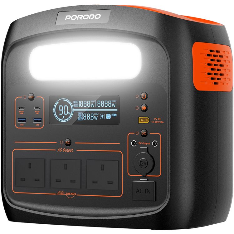 Porodo 1500W Forcebase Portable Power Station with Multi-Mode LED Lighting, PD 100W, Solar Charger, 3× AC Sockets, 1.3 Hours Charging Time, 1102.5Wh Battery Capacity, Multiple Output Ports - Black / Orange