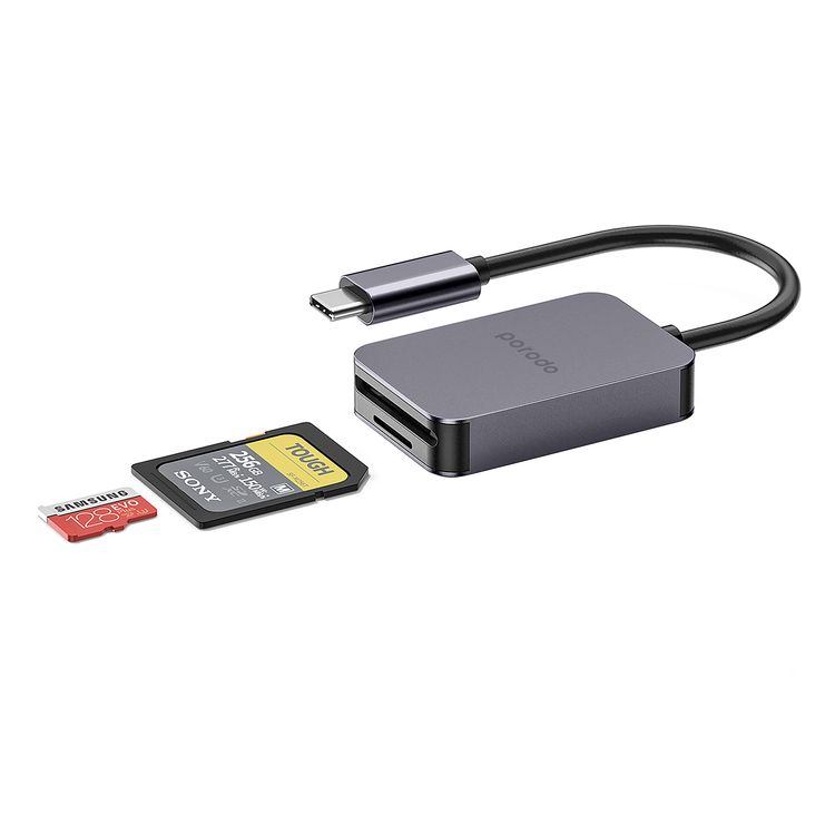 Porodo 2-in-1 USB-C Card Reader with Type-C Input, SD V4.0 & Micro SD V3.0 Super Speed Slots, 5 Gbps Data Transfer Speed, Super Lightweight and Portable - Gray