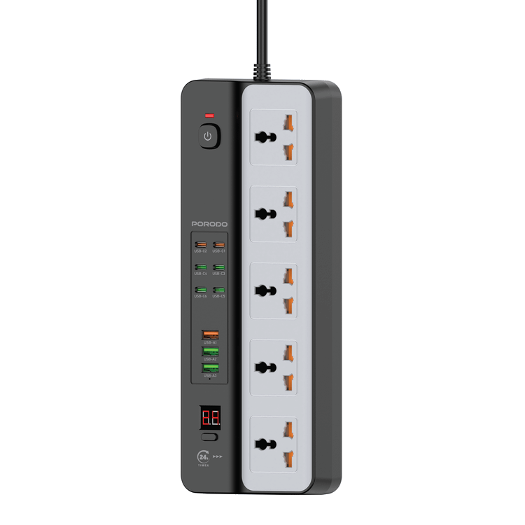 Porodo 3000W Universal Power Strip with 5×AC Sockets, 6×Type-C Ports, 3×USB-A Ports with QC 20W, 35W Power Delivery, 24-Hour Timer, Built-in Surge Protection, Fireproof PC Material, UK 3-Pin Plug with 3m Cord Length, Multi-Device Charging - Black