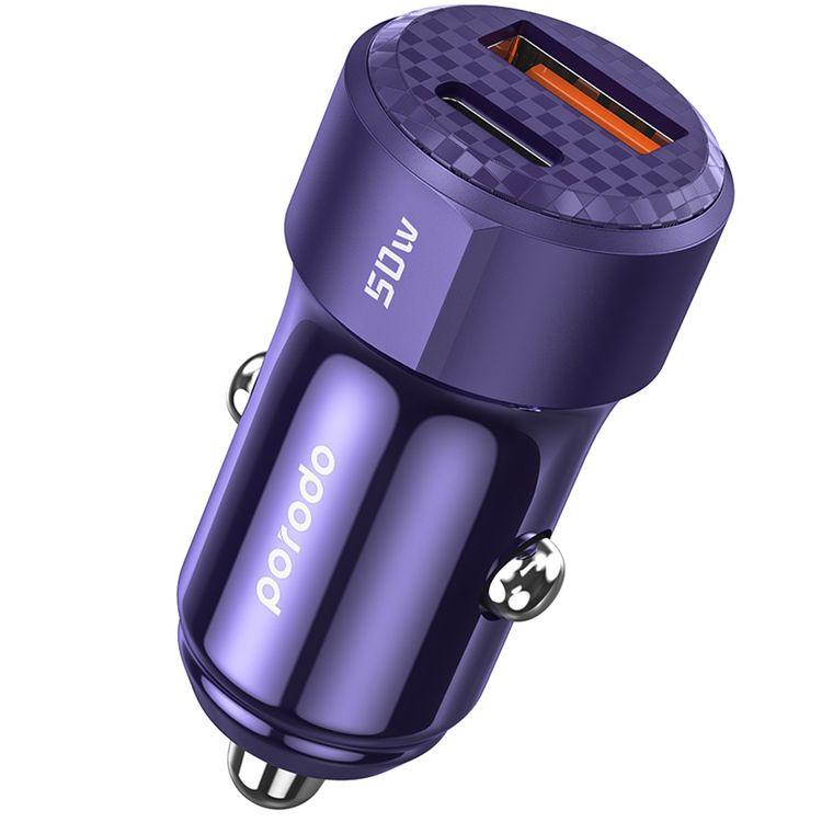 Porodo 50W Dual Port Car Charger, 20W Power Delivery, Simultaneous Fast Charging, 30W Quick Charge, Multi Protection, Carbon Fiber Print, Lightweight & Portable - Purple