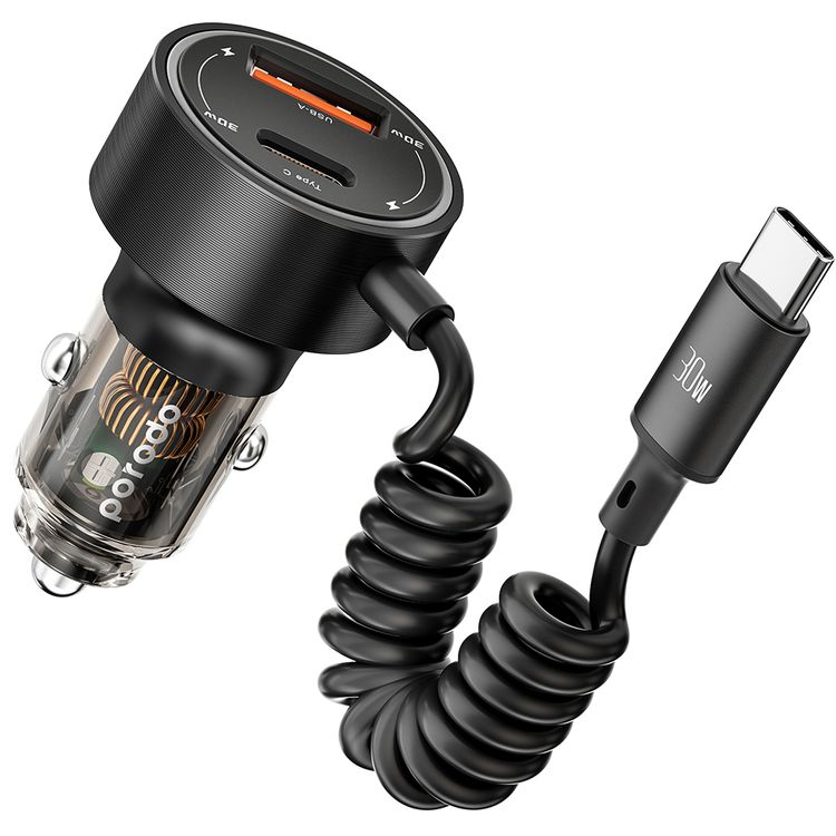 Porodo 60W Transparent Dual Port Car Charger with PD 30W & QC 18W, Integrated Type-C Cable, Aluminum Alloy & PC Material, Universal Compatibility, Simultaneous Charging - Black