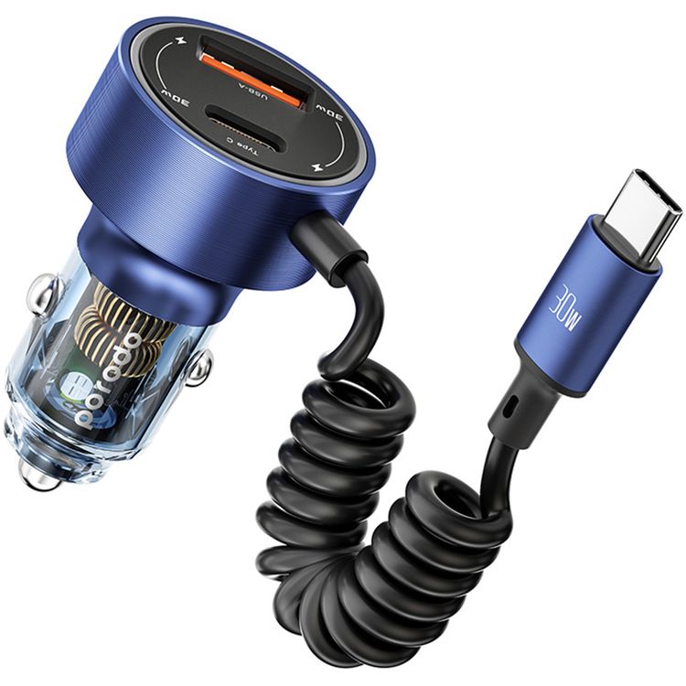 Porodo 60W Transparent Dual Port Car Charger with PD 30W & QC 18W, Integrated Type-C Cable, Aluminum Alloy & PC Material, Universal Compatibility, Simultaneous Charging - Blue