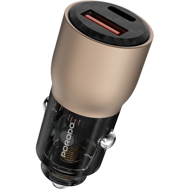 Porodo 95W Transparent Car Charger, Zinc Alloy & PC Material, 30W USB-A & 65W USB-C Outputs, Simultaneous Fast Charging, Universal Compatibility - Desert Titanium