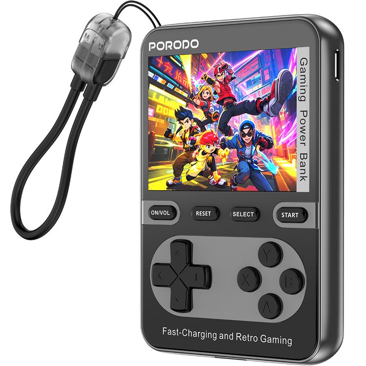 Porodo Arcadevolt 10000mAh MagSafe Power Bank with Built-in Console, +100 Classic Games, PD 20W, 2.8" HD Display, Type-C Lanyard Cable - Black