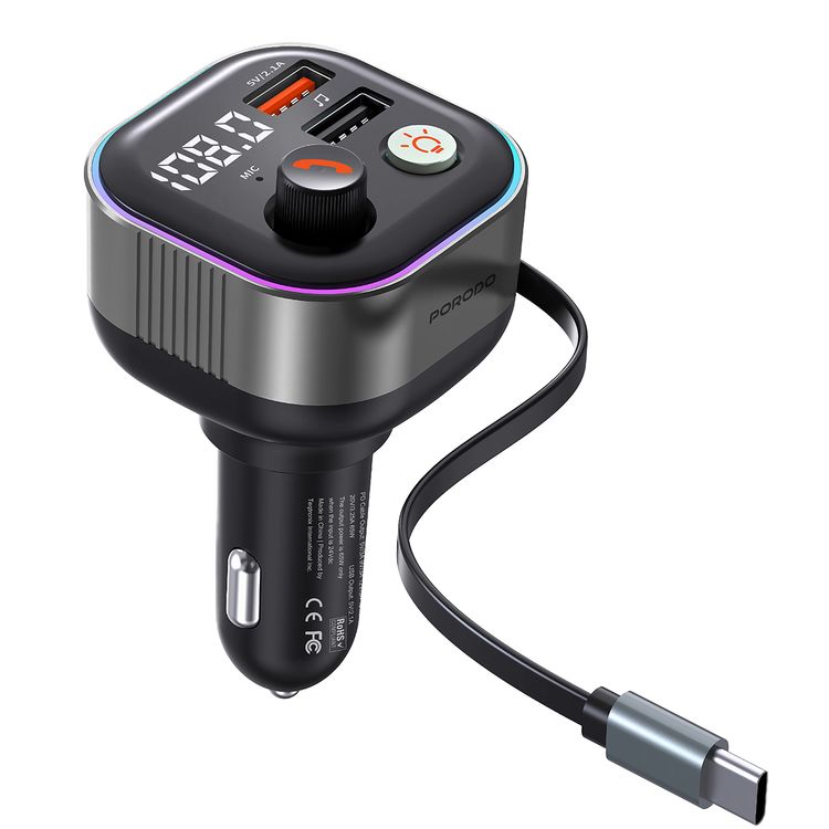 Porodo Audio Boost Bluetooth FM Transmitter Quick-Charge Car Charger with 65W PD, USB-A & USB-C Outputs, USB Flash, 80cm Retractable Type-C Cable, 87.5-107.8 FM Frequency, LED Ambient Lighting, Universal Compatibility - Dark Gray