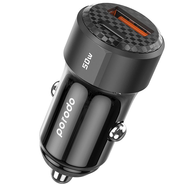 Porodo 50W Dual Port Car Charger, 20W Power Delivery, Simultaneous Fast Charging, 30W Quick Charge, Multi Protection, Carbon Fiber Print, Lightweight & Portable - Black