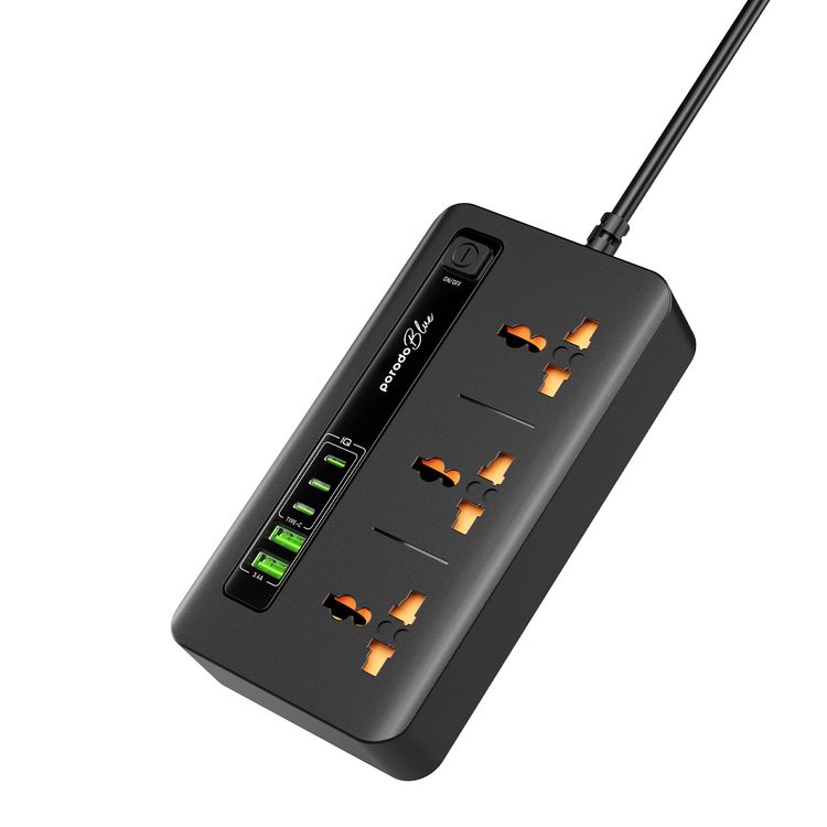 Porodo Blue Multiple Ports Power Hub with ×2 USB-A & ×3 USB-C Ports, 3 AC Sockets, 3000W Rated Power, 2m Cable Length, Universal Compatibility - Black