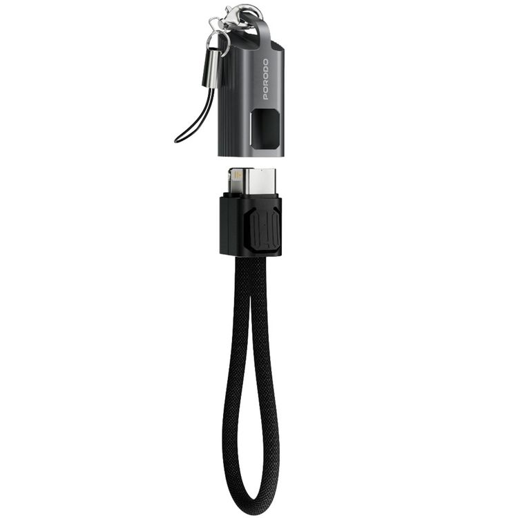 Porodo Chargeloop Keychain USB-C to Lightning Data Cable with 30W PD Output, 480Mbps Data Transfer Rate, 20cm Cable Length, Durable Zinc Alloy & Nylon Braided Material, High-Speed Charging, Compact Design - Black
