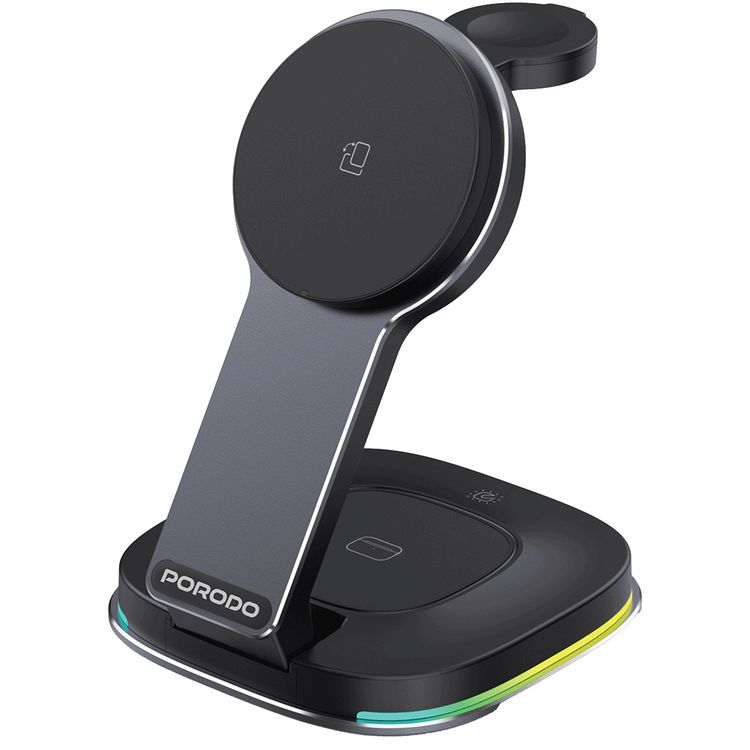 Porodo Compact Folding Wireless Charging Stand with 15W Wireless Output, Folding Design, 2.5W Watch Output, One-Touch Light Control, RGB Lights - Black