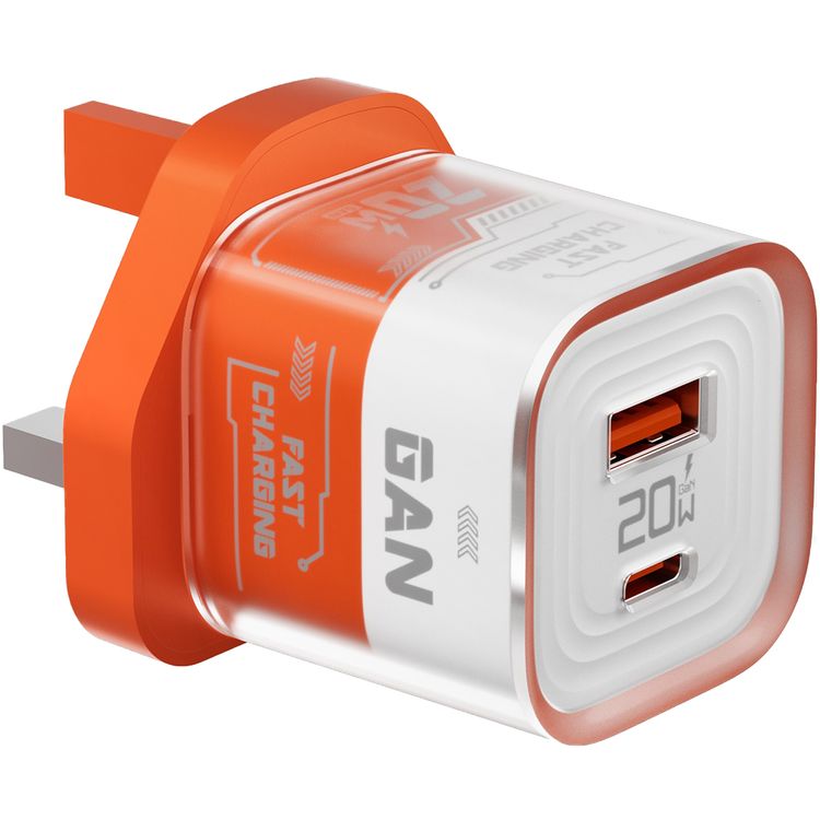 Porodo Crystal Shell GaN Wall Charger with 20W Power Delivery, Simultaneous Charging, Overheat Protection, 18W USB-A Output - Orange