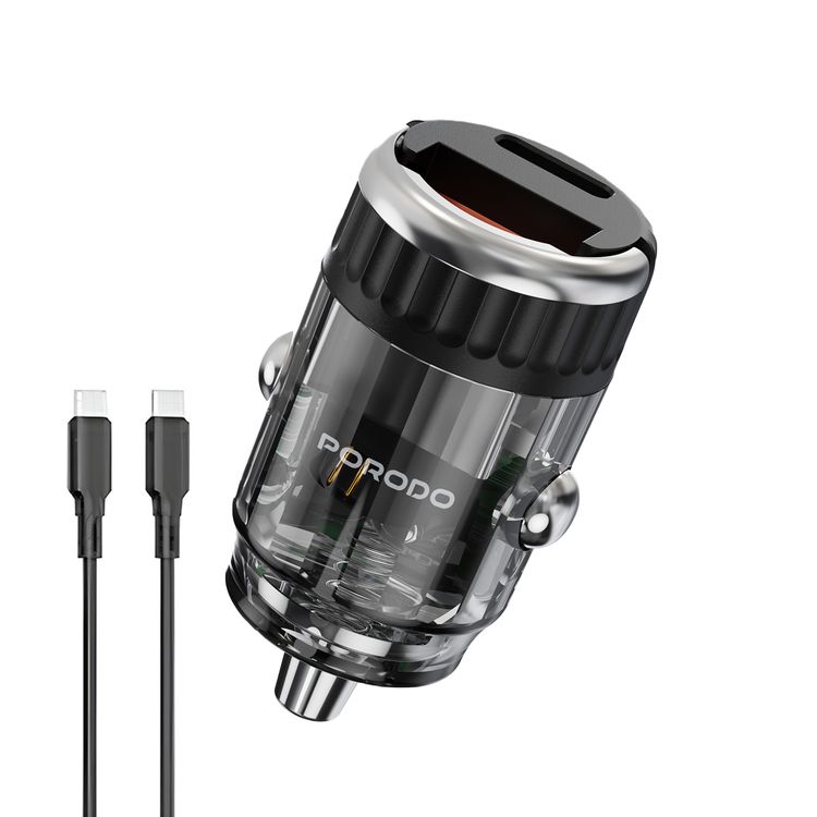 Porodo Dual Port Transparent Car Charger with USB-C to USB-C Cable, PD 36W, QC 18W, USB-A & USB-C Ports, Pull Ring Handle, Fast Charging Technology, Smart Charging Protocols, Universal Compatibility - Black