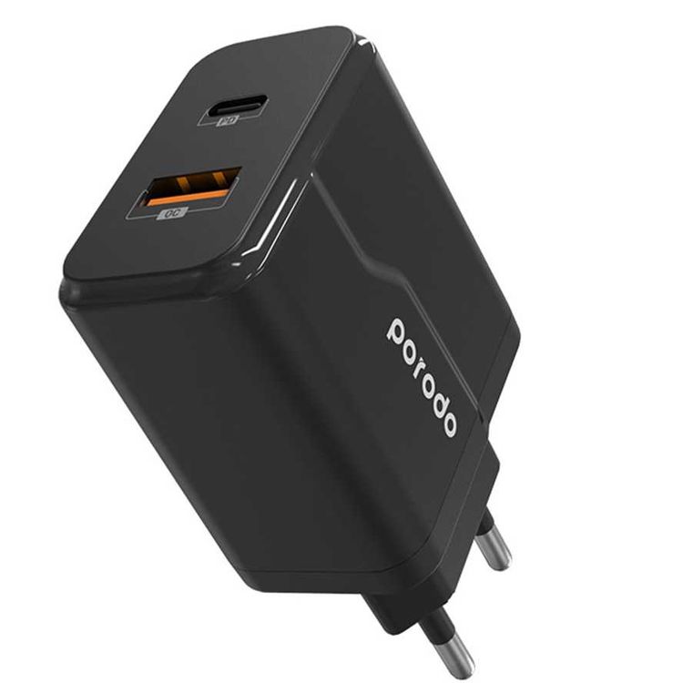 Porodo USB-C Adapter comes with 18W Power Delivery. This ultra-compact wall charger is enough small to carry around with you without being worried about managing your spaces. Use this full-speed charger to save your time, in another hand, you can charge your smartphone from 0 to 60% just in 30 minutes. Notice that the charging time is dependent on your device usage.Super compact and fast, 18W wall charger will help you to speed up your charging with a protective mechanism for safety. Porodo Dual-port USB-C PD and USB-A QC wall charger is super-compact and is designed to charge in a fast mood with 18W power delivery and 2 Pin Plug type. This wall charger has been designed to be protective against over-charging, and over-heating, and is made with fire-resistant material. Compatible with cellular phones.