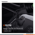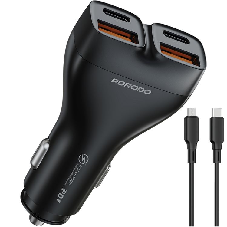 Porodo Dual Power Car Charger with USB-C to USB-C Cable, PD 30W, QC 18W, ×2 USB-A & ×2 USB-C Ports, 102W High Power Output, Fast Charging Technology, Smart Charging Protocols, Compact Design - Black