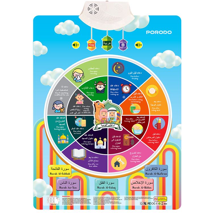 Porodo Kids Educational Interactive Dua Chart Wall, ×3 AA Batteries, 2 Languages, 5 Surahs,16 Duas, Child-Friendly Interface, Practice & Memorization Tool, Interactive Poster and Voice Guidance - Blue