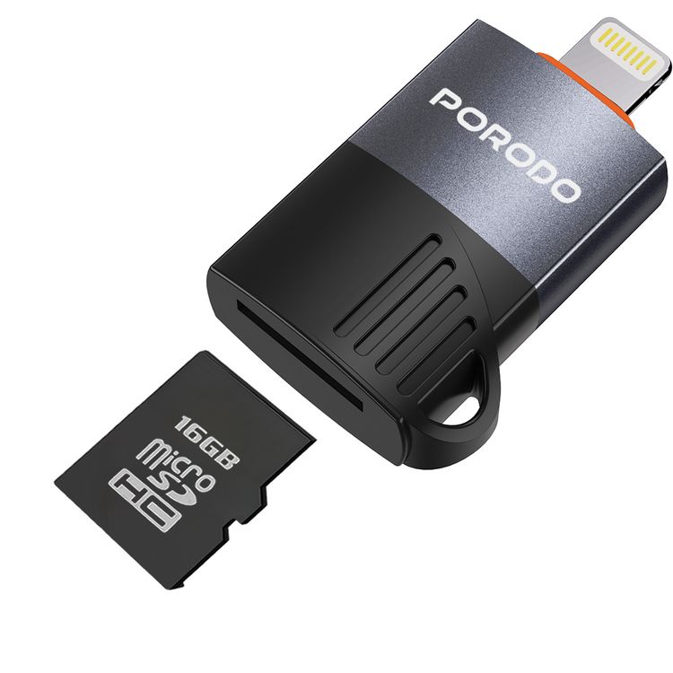 Porodo OTG Adapter with Lightning Input, TF Card Reader, 480Mbps Transfer Speed, TPE Material with Aluminum Shell, Wide Compatibility - Black