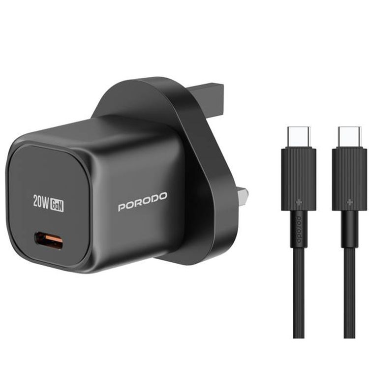 Porodo PD 20W UK Fast Charger with USB-C to USB-C Cable, 20W Power Output, Over-Heat Protection, Reliable Companion - Black