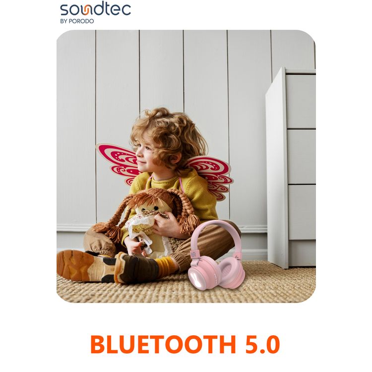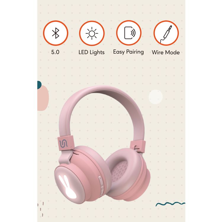 Porodo Soundtec Kids Rabbit Wireless Headphones with Clear Sound, Superior Microphone, LED Lights, Up to 30 Hours Playtime, 10m Bluetooth Range - Pink