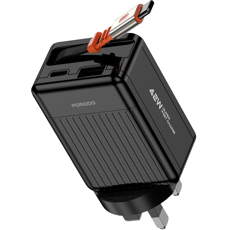 Porodo Super Quick GaN Charger with 75cm Retractable Type-C Cable, 42W Power Delivery, Simultaneous Charging, 22.5W USB-A Output, Built-in Safeguards - Black