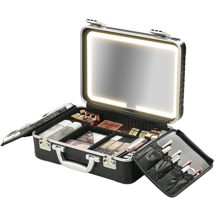 Porodo Travel Makeup Case with Detachable LED Mirror, 3000mA Battery, 144 LED Beads, 2800-6500K Color Temperature, 3 Light Modes, USB-C Charging Interface, Multiple Compartments - Black
