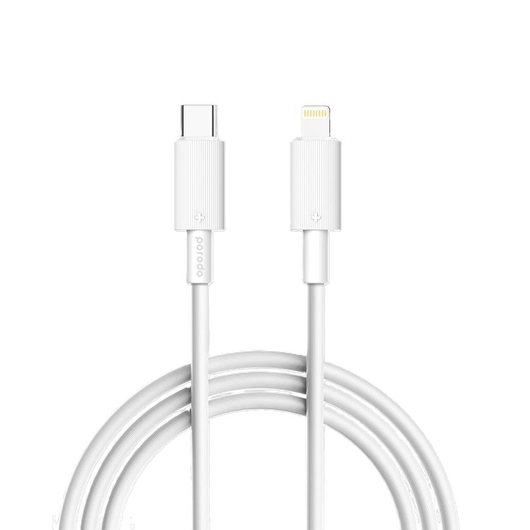 Porodo Type-C to Lightning PVC Cable 3m, 480Mbps Transfer Speed, PD 27W, more than 15000 Bends Life Span, Tangle Free - White
